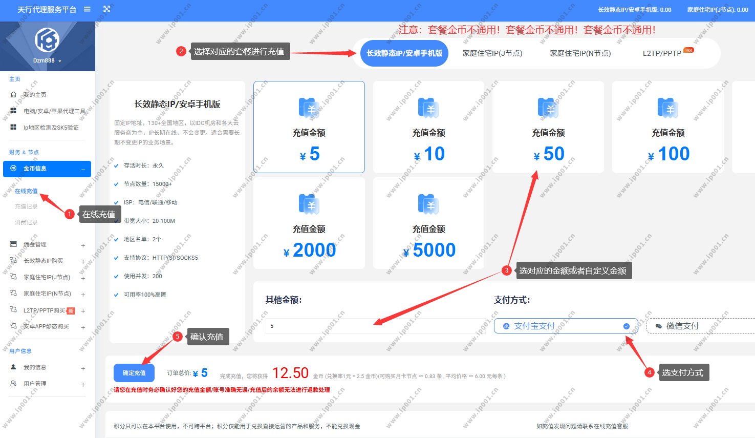 点击金币信息 → 在线充值 → 选择套餐 → 输入金额 → 选择支付方式 → 确认充值。 💡 注意:套餐金币不通用,金币不支持提现,请根据实际需求充值