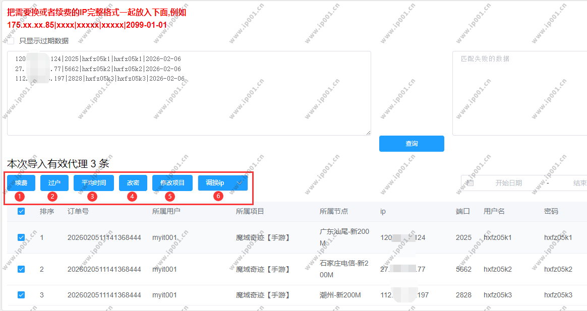 找到已购套餐 → 点击导入操作 → 粘贴节点信息 → 点击查询 → 勾选目标节点 → 选择续费/调换/改密等 → 完成操作。