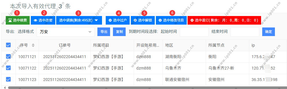找到已购套餐 → 点击导入IP → 粘贴节点信息 → 点击匹配 → 勾选目标节点 → 选择续费/更换/改密等 → 完成操作。